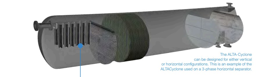 The ALTA-Cyclone consists of a series of cylindrical tubes internally mounted on a manifold that is either welded or flanged to the inlet nozzle of the vessel. Retrofit designs are available for existing vessels where welding to the vessel wall