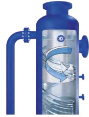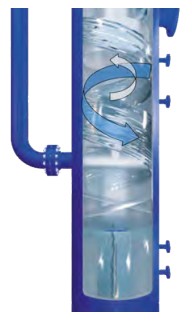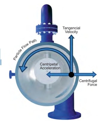 The centrifugal force exerted on the process fluid overcomes buoyancy and drag forces, resulting in the heavier particles (liquids/solids) migrating to the outer wall of the cyclonic device and the lighter particles (gas) to the central axis where they are separated.