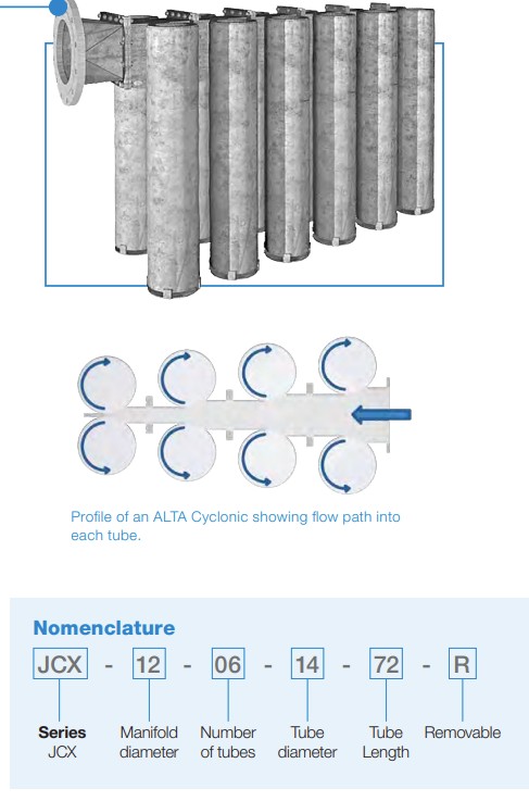 The Cyclonics ALTA-Cyclone is a cyclonic inlet device that utilizes a tangential entry to create centrifugal acceleration.