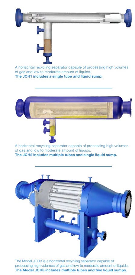 Inline recycling separators can utilize single tube designs such as the Model JCH1, or multiple tube designs such as models JCH2 or JCH3. Multiple tube designs are required when the desired capacity exceeds the capability of a single tube