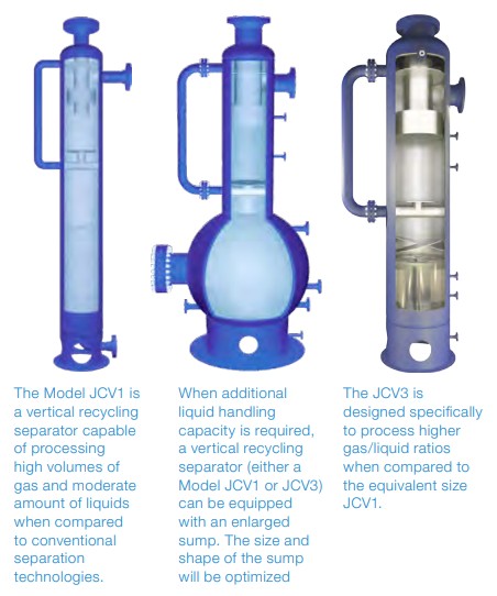 Vertical Recycling Cyclonic Separators use two stages of separation to remove liquid and solid contaminants and achieve high separation efficiency.