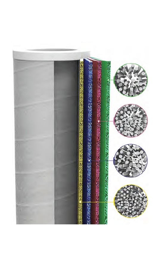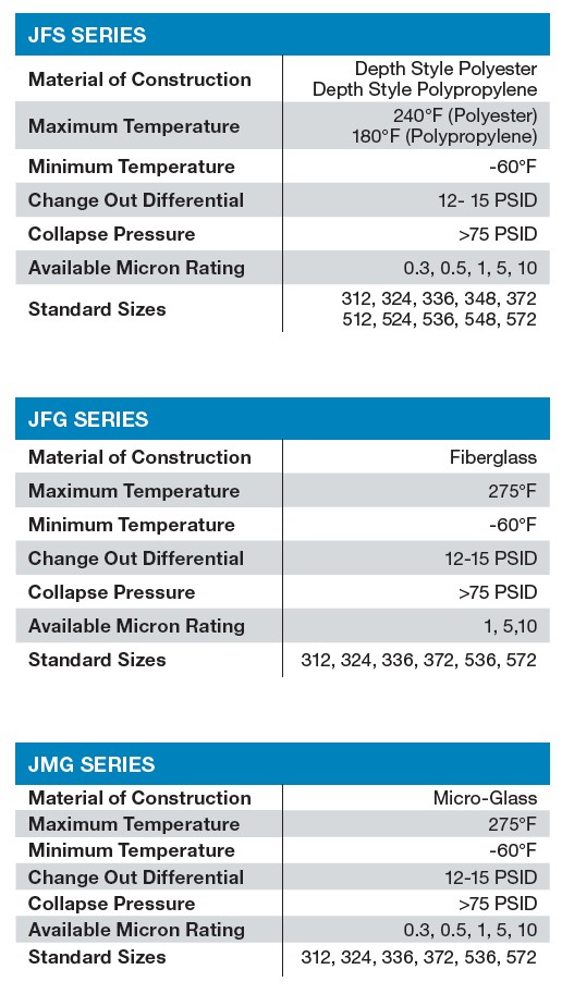 Jonell Systems patent pending TRI-SHiELD™ JFS Series media cartridges with blend of Tri-Lobal and cylindrical fibers in combination with the engineered gradient depth all in the same media matrix provides pre-coalescing and 20% higher dirt loading compared to conventional depth cartridges.